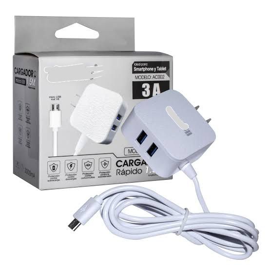 AC002 Cargador Para Celular Con Entrada V8 y 2 Puertos USB Extra